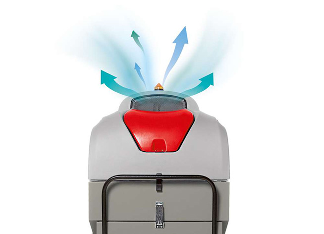 - Ο φιλτραρισμένος αέρας εξέρχεται από τη σχάρα στο πίσω τμήμα του μηχανήματος και η σκόνη εναποτίθεται γύρω από το μηχάνημα χωρίς να ανυψώνεται στον αέρα με αποτέλεσμα να εξασφαλίζεται εξαιρετικό αποτέλεσμα καθαρισμού.